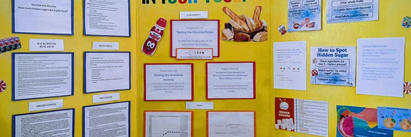 Experiment #1. Assessing the Glucose Strips: - The goal was to make sure the glucose test strips were working properly. - First, we made the positive control with glucose powder. We measured the glucose powder and diluted it as we went down the percentages of glucose in the cups. To do this, we made a dilution series to create the following concentrations: 2%, 1%, 0.5%, 0.25%, 0.125%, and 0.0625% (we also had a negative control). Then we dipped glucose test strips into the seven solutions. We matched the colour on the glucose test strips to the colour chart on the glucose test strip container. - Because we were able to confirm that the glucose test strips were working, we proceeded with Experiment #2. Experiment #2. Assessing the Invertase: - The goal was to get the linear time point for sucrose calculation by using invertase solution with 10% sucrose solution. - We evaluated the activity of the invertase enzyme by investigating how long it will take to turn a known sucrose solution amount into glucose. We wanted to find the time we will use to evaluate our selected food samples. We made an invertase solution one day before starting the experiment. We also made a 10% sucrose solution. Prepared thirteen test strips labeled 0mins, 5mins, 10mins, 15mins, 20mins, 25mins, 30mins, 40mins, 50mins, 60mins, 70mins, 80mins, and 90mins. We set a 90 min timer. We added fifteen drops of the pre-made invertase enzyme solution to the 10% sucrose solution. We evaluated how much sucrose the invertase made into glucose each 5min time points up to 30min, then every 10mins until 90min after that. We recorded our results and made a graph to find our plateau point, then find our linear time point. We used these results to use in our third experiment. Experiment #3. Testing the Food Samples for Glucose Concentration Before and After Adding Invertase - Our goal of this activity was to evaluate our hypothesis and find hidden sugars in our selected foods. - We found different testing foods around the house, and we found six foods to assess in our experiment. (Apple grape juice, honey water, tomato sauce, bread water, raspberry yogurt, and chocolate ice cream). Ensured that all food samples were at room temperature by leaving them out overnight. - made sure the samples with high glucose concentration was diluted and we noted the dilution ratios (e.g. 1:10, 1:2). We pre-evaluated the food solution by using glucose test strips. If the colour changed to deep brown (maximum range 2%) before 30 seconds, we diluted the food samples until the test strips showed a colour within the allowable range (0.1-1%, or light green to light brown). Prepared 3 food samples (as multiple trials made sure our results are accurate) - We assessed the glucose test strip BEFORE adding the invertase enzyme solution. This was at 0 minutes. Added fifteen drops of invertase enzyme solution, then mixed each cup for 30 seconds. Waited 20mins (linear time point, found from Experiment #2). Lightly mixed food solution, then evaluated with the glucose test strip and recorded the colour/glucose concentration at 30 seconds for each sample. We then recorded the readings on chart, completed calculations with our parents help to find the "original sucrose concentration", which allowed us to find the hidden sugars.