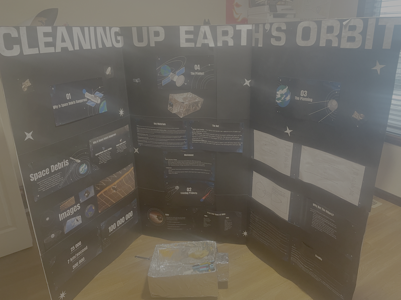 How to clean up the growing threat of space debris efficiently. This project encompasses the standard trifold with thorough information, and what sets this apart, a prototype of the actual launcher that works (without the chemical reaction/explosion part)
