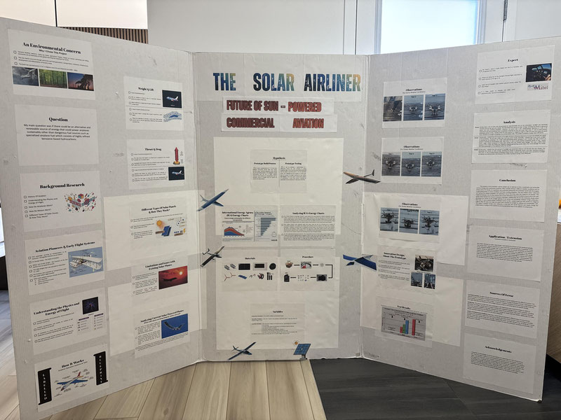 My project is about building a solar powered model of a plane to test my theory for Sun Powered Commercial Aviation. I have researched aviation science concepts and modified them so they can be applied in commercial planes to generate power using the sun.