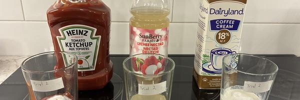 Step 1. Mix 2 grams of calcium lactate into 100g of each of the liquids in a glass cup (ketchup, cream and lychee juice) and blend well with a hand blender (15 seconds for cream and 30 seconds for ketchup and lychee juice). Take a small amount of each liquid and measure the pH with a pH meter. Record the number.